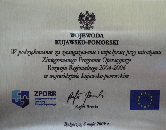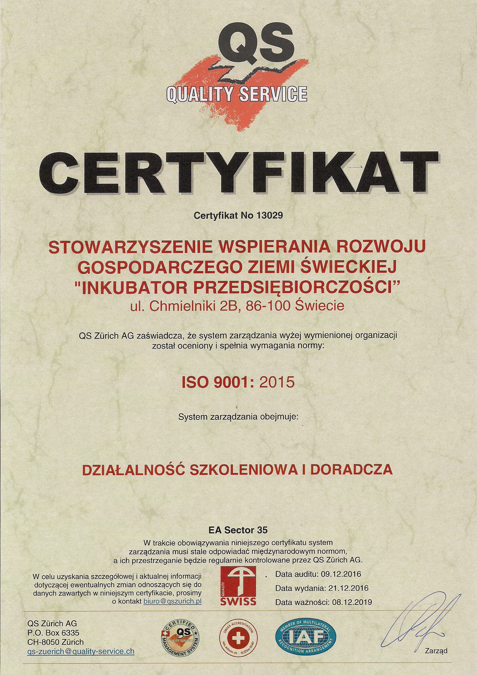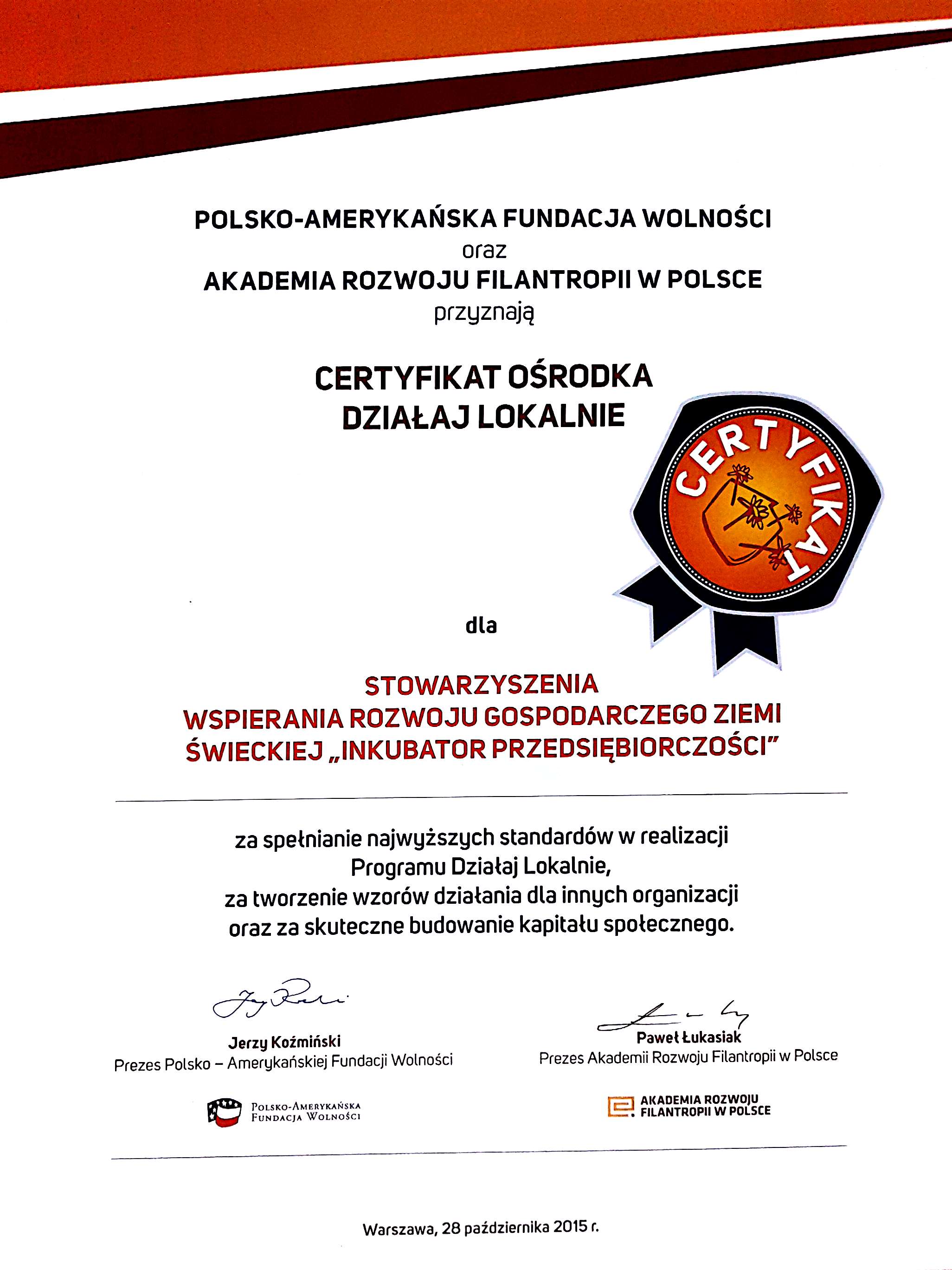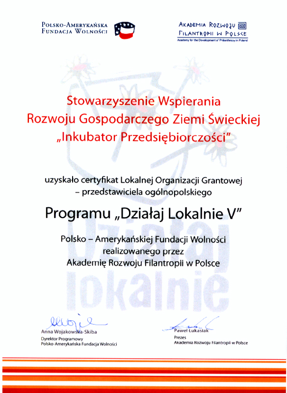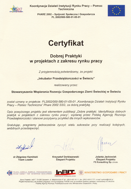 Certyfikaty Uzyskane przez Stowarzyszenie Rozwoju Gospodarczego Ziemi Świeckiej "Inkubator Przesiębiorczości"