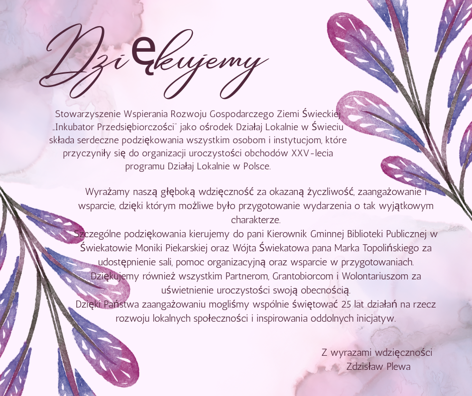 Szczególne podziękowania Stowarzyszenie Wspierania Rozwoju Gospodarczego Ziemi Świeckiej „Inkubator Przedsiębiorczości” kieruje do Kierownika i Zespołu GBP w Świekatowie za pomoc w organizacji wydarzenia, Młodzieżowej Orkiestry Dętej OSP za uświetnienie uroczystości, Wójta pana Marka Topolińskiego oraz pana Jakuba Gackowskiego za relację fotograficzną.
