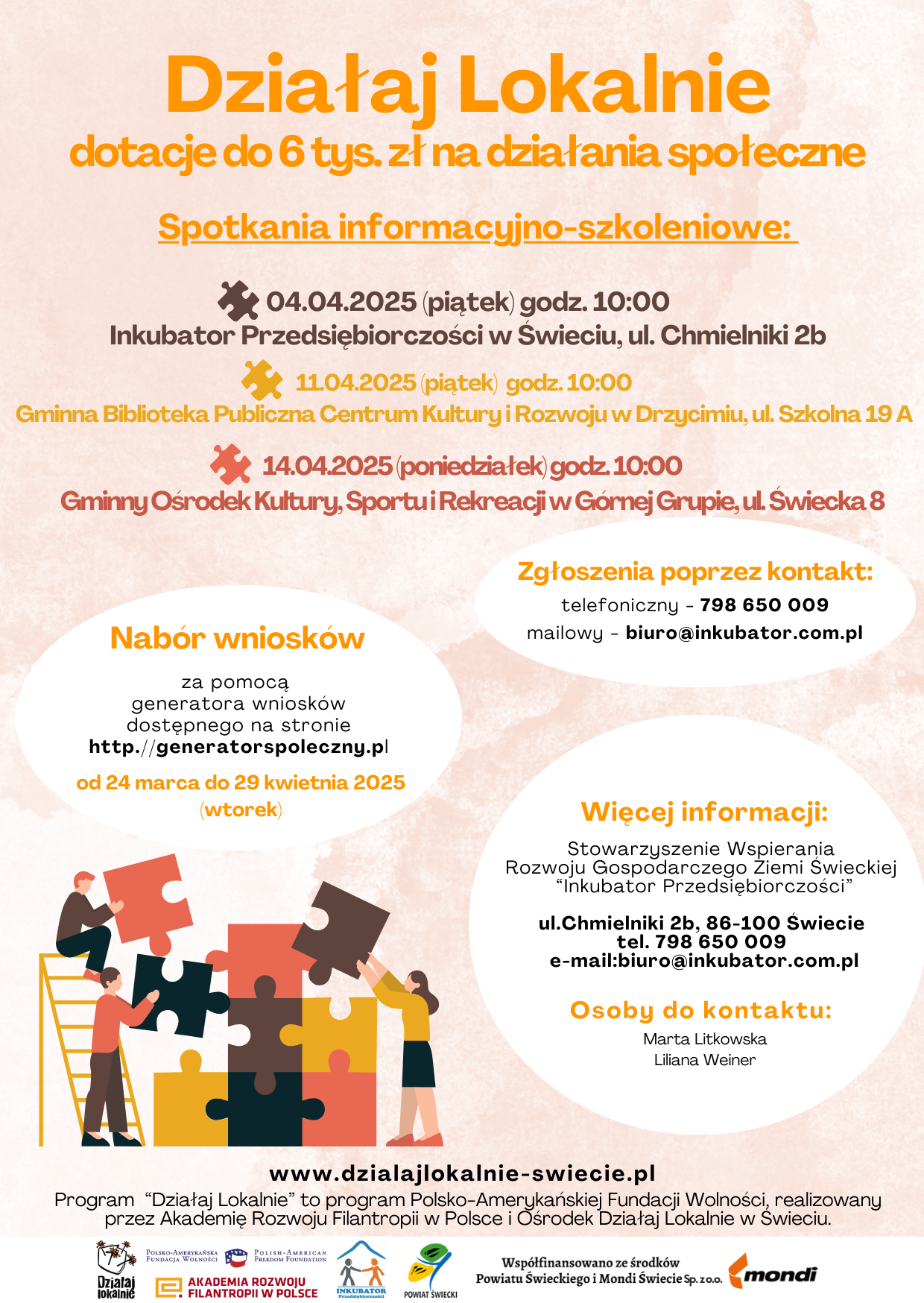 ZGŁOSZENIE: obowiązują formularze zgłoszeniowedostępne w biurze Inkubatora oraz na stronie www.inkubator.com.pl(zgłoszenia przyjmujemy do 23.06.2025 r.)