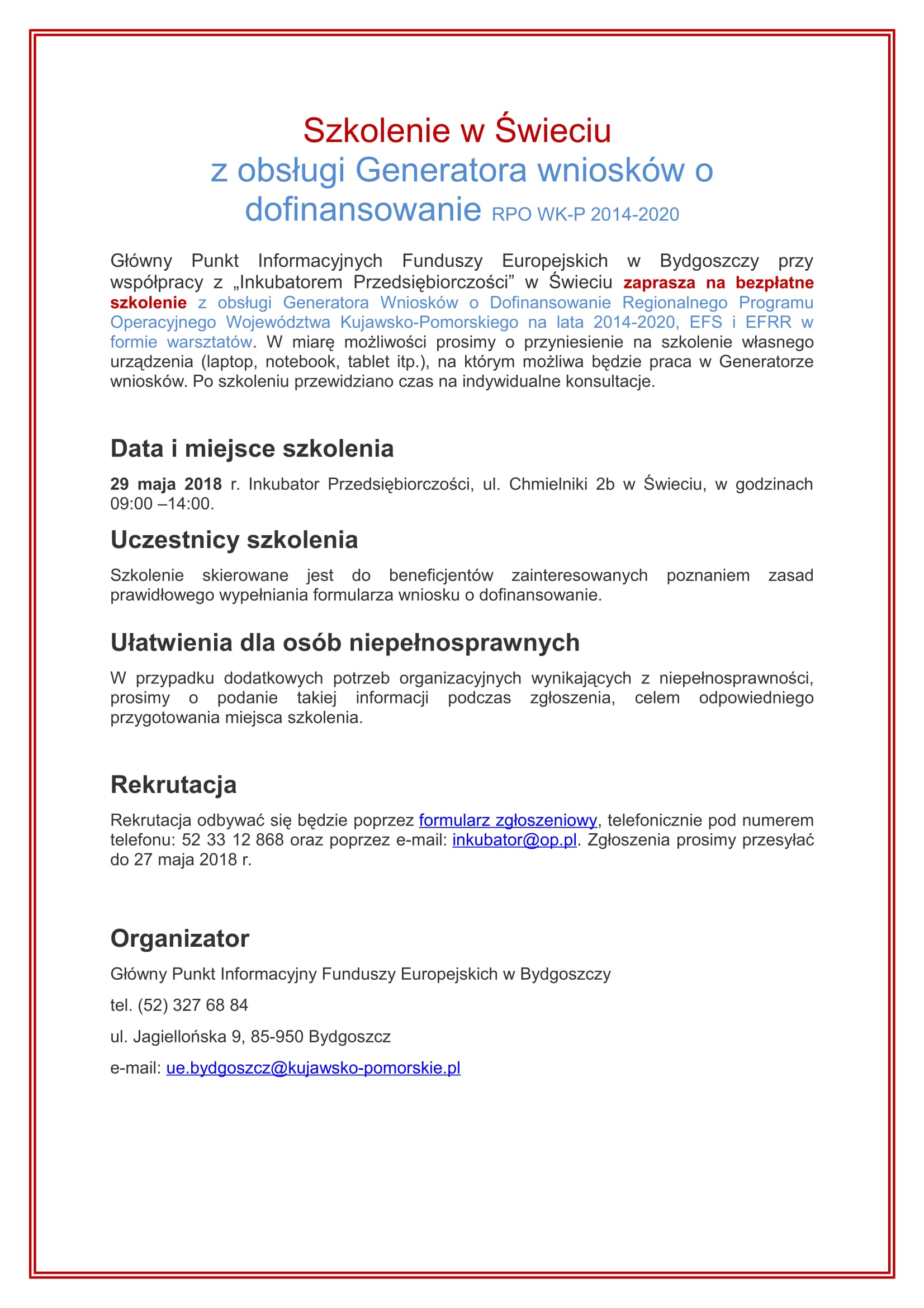 29 maja 2018 r. we współpracy z Głównym Punktem Informacyjnym Funduszy Europejskich W Bydgoszczy w Inkubatorze odbyło się szkolenie z obsługi generatora Wniosków o dofinansowanie w ramach RPO WK-P. W szkoleniu wzięło udział 11 osób.