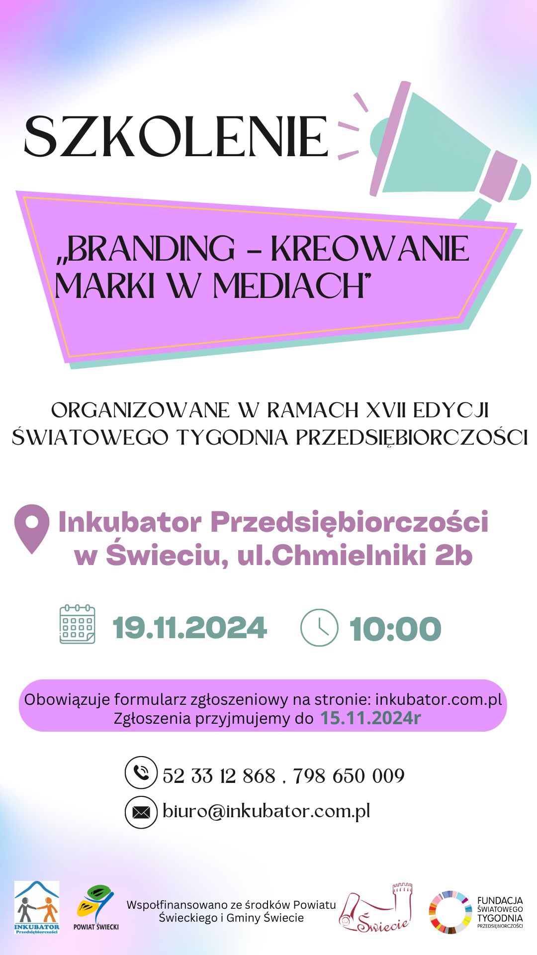 19 listopada 2024r. odbyło się szkolenie dotyczące brandingu, kreowania marki w mediach skierowane do przedsiębiorców z terenu powiatu świeckiego.