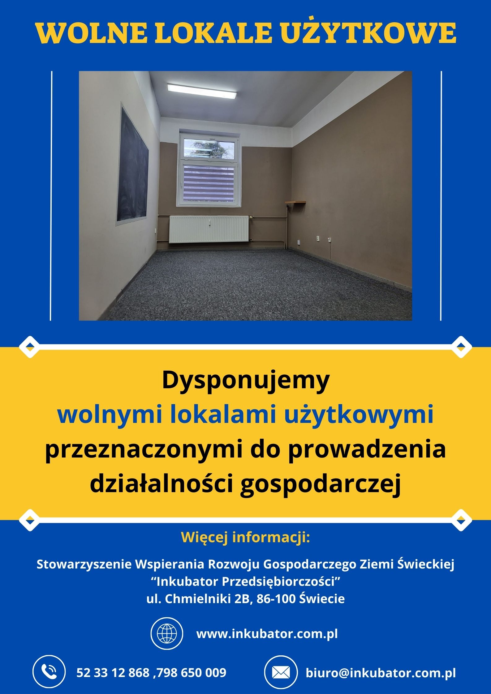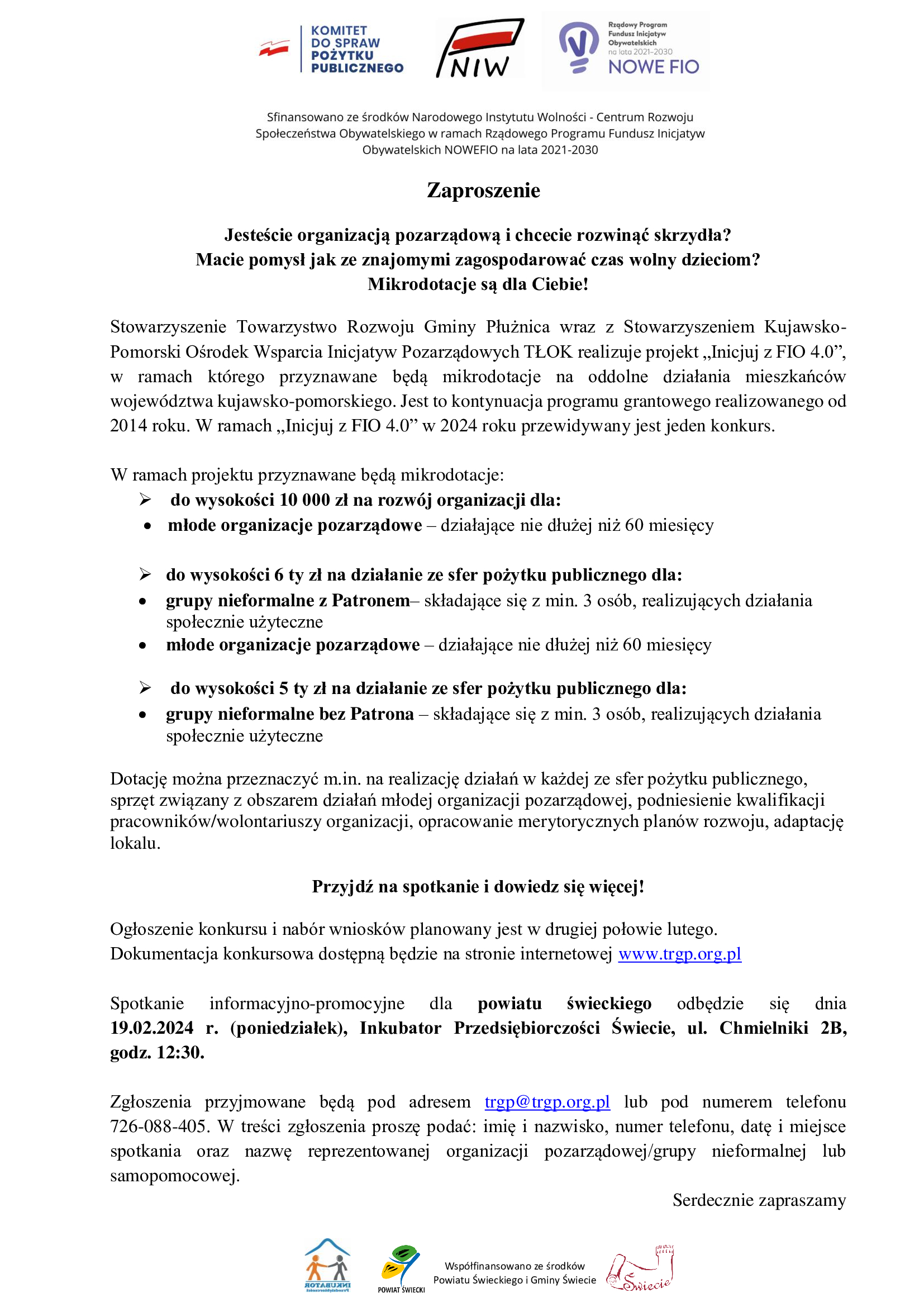 Miejscem udostępnionym na powyższe spotkanie będzie siedziba Inkubatora Przedsiębiorczości, ul. Chmielniki 2b, Świecie -sala konferencyjna.