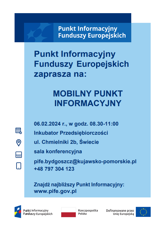 Inkubator Przedsiębiorczości oraz Lokalny Punkt Informacyjny Funduszy Europejskich w Bydgoszczy zaprasza na Mobilny Punkt Informacyjny.