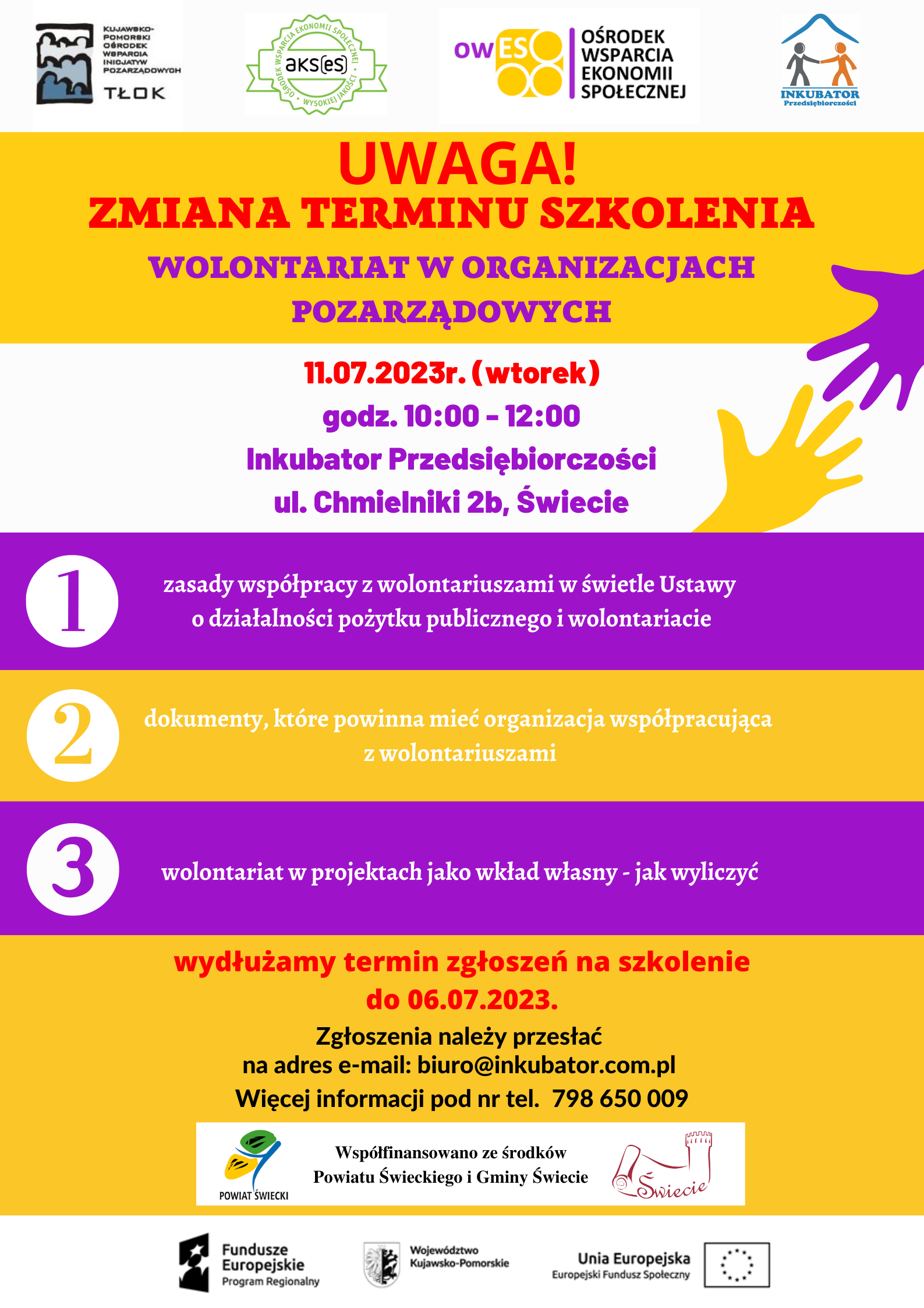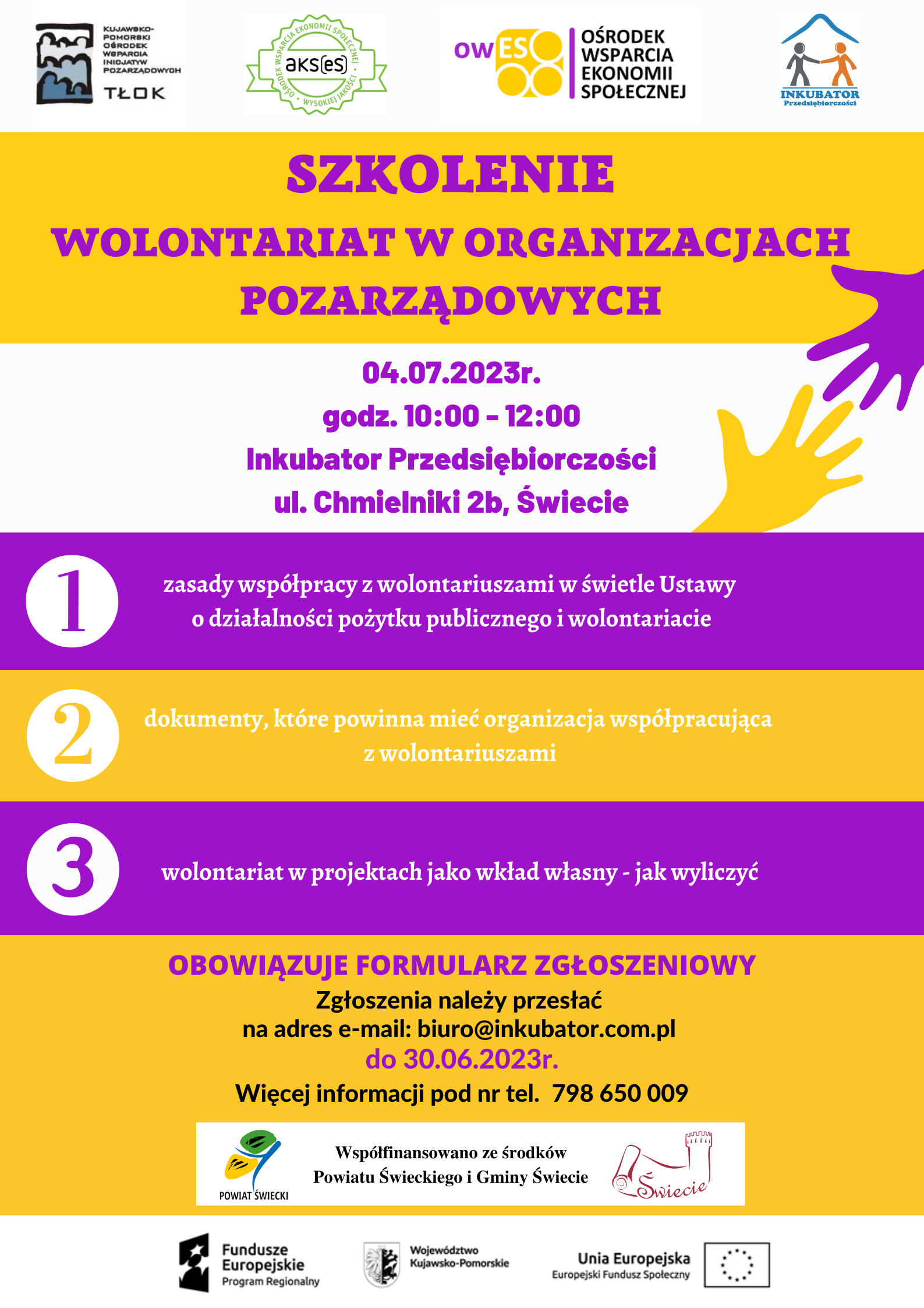 11 lipca br. w Inkubatorze Przedsiębiorczości w Świeciu odbyło się szkolenie dotyczące wolontariatu w organizacjach pozarządowych, w którym wzięło udział 6 osób. Uczestnicy zapoznali się z zasadami współpracy z wolontariuszami w świetle Ustawy o działalności pożytku publicznego i wolontariacie oraz dokumentami, które powinna posiadać organizacja współpracująca z wolontariuszami. Szkolenie poprowadziła animatorka, doradczyni i edukatorka w OWES TŁOK - Elżbieta Oskwarek.